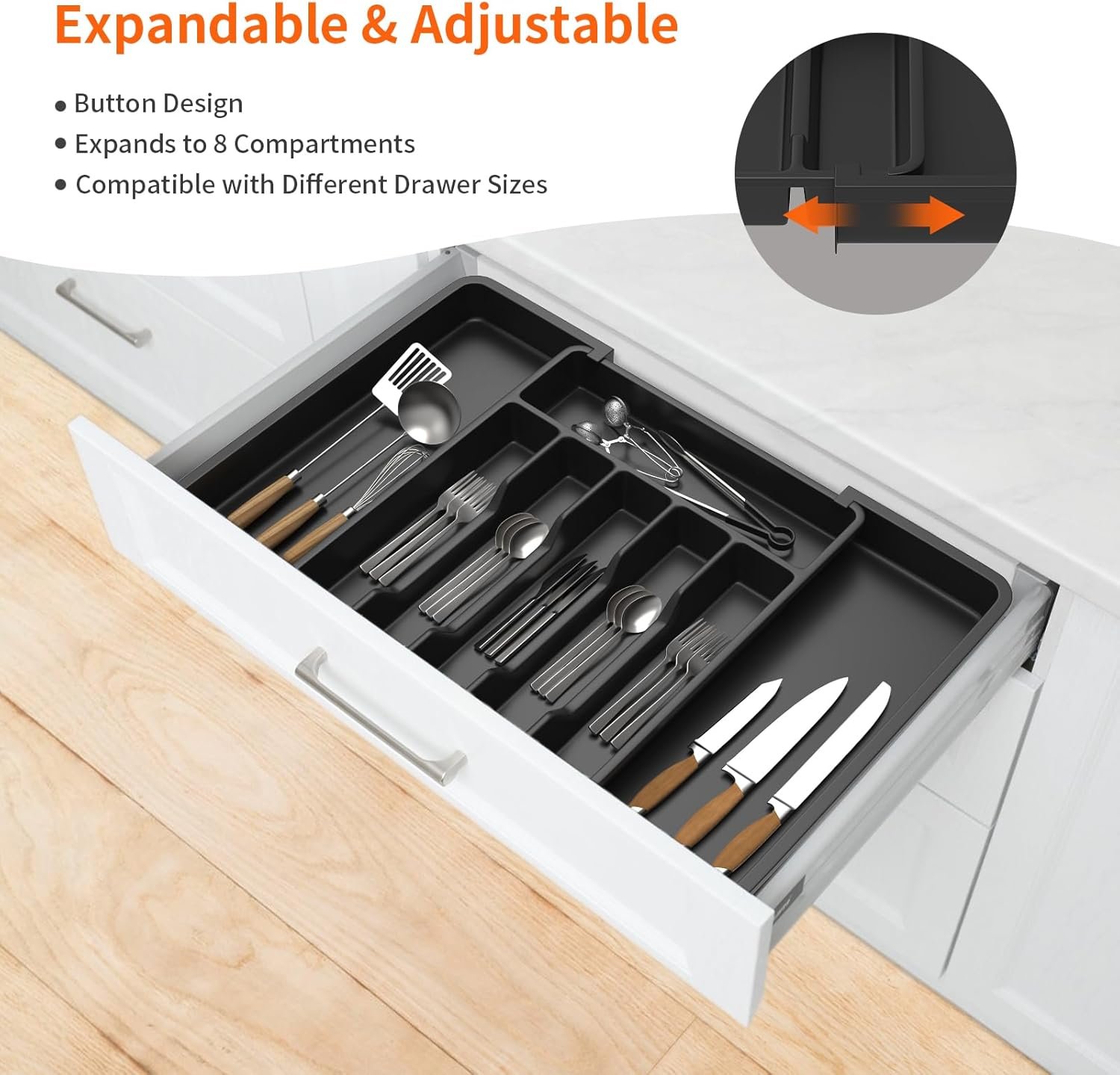 The Lifewit utensil organizer can be expanded from 7 compartments to 9 compartments, allowing for storage of more utensils, cookware, and kitchen tools.
